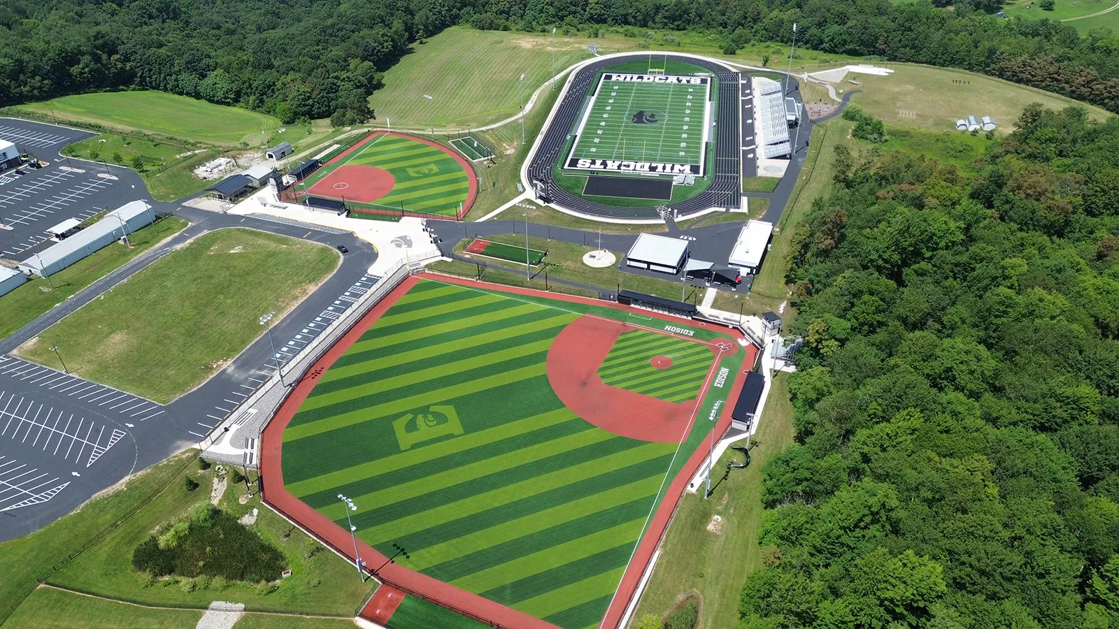 The complex features a new football stadium with grandstands and a synthetic turf field, along with new synthetic turf baseball and softball fields. Site design also included a formal complex entrance and various support structures, including a restroom/concessions building, a halftime room with restrooms, a referee area, and a trainer’s room. Additional elements included site layout and permitting for a new fieldhouse, a nature trail, and a cross country viewing platform.