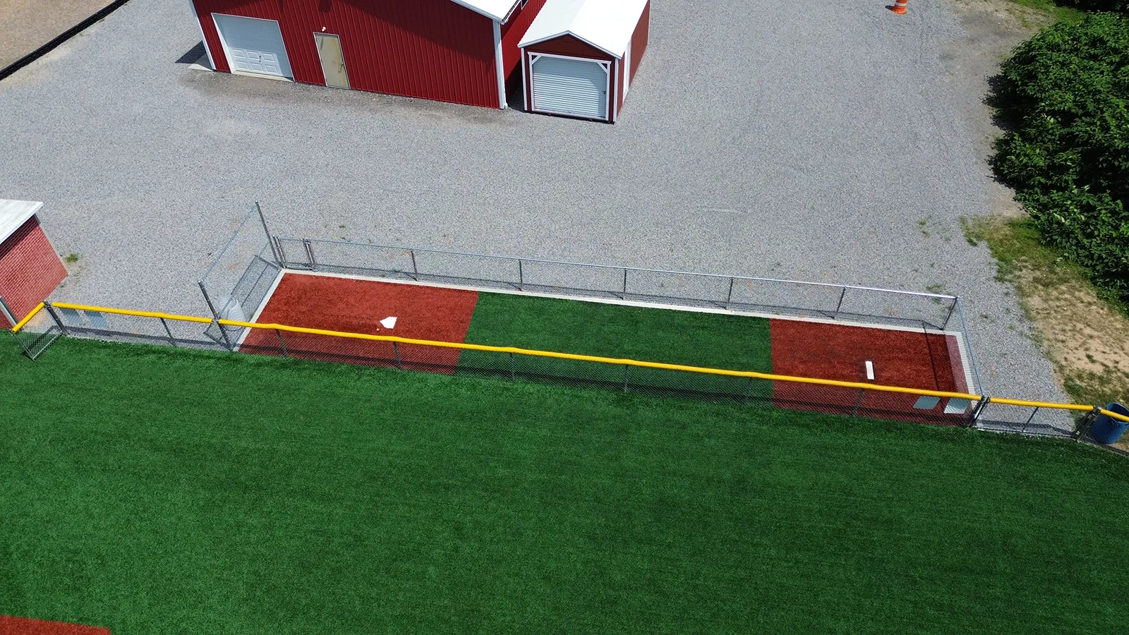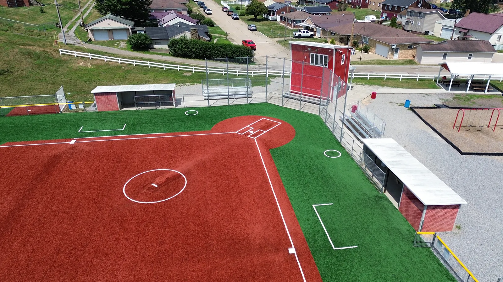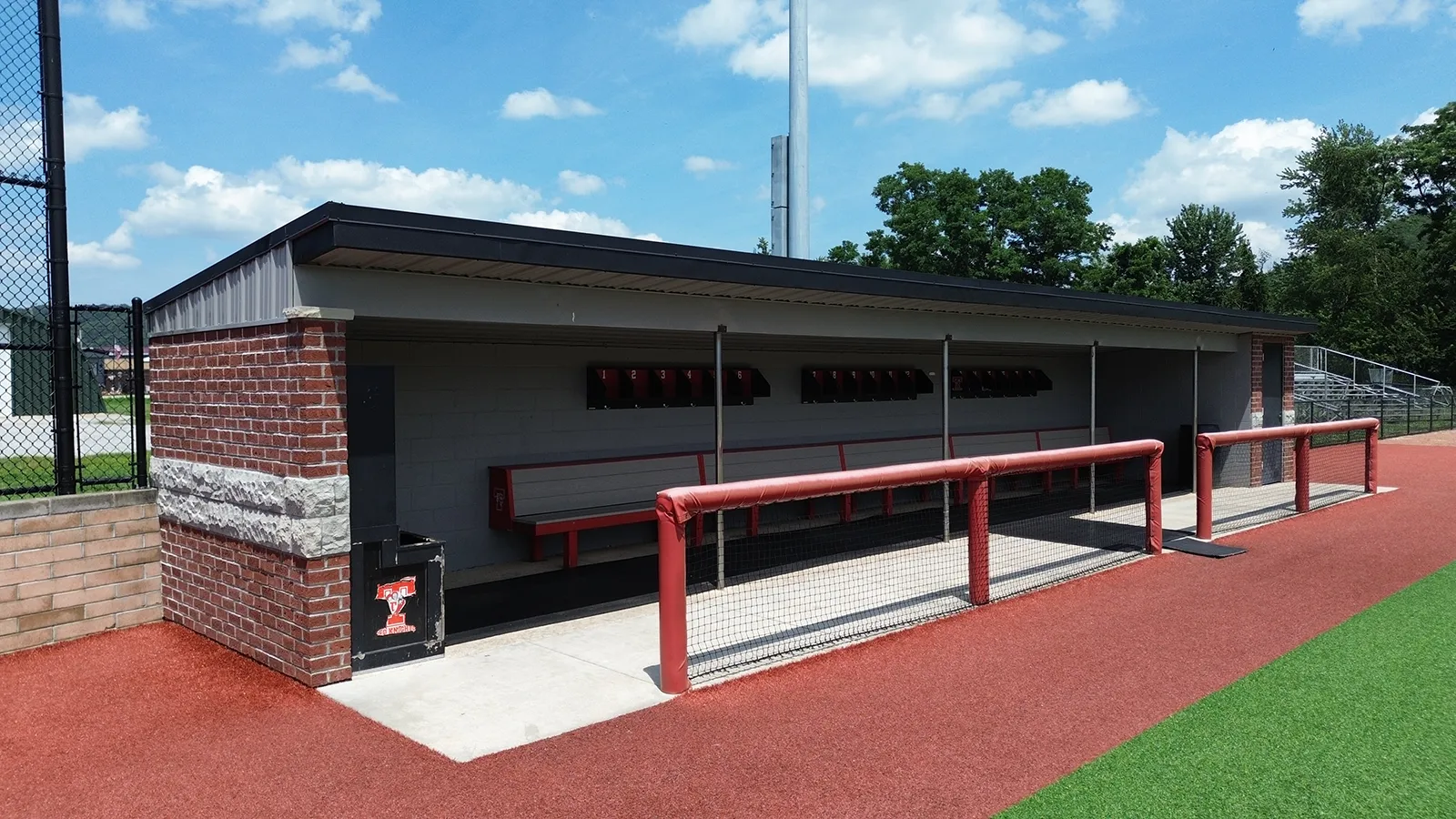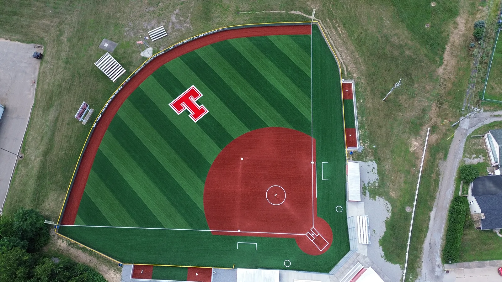 The adjacent softball field, a regulation 200-foot high school field last renovated in 2016, was also converted to synthetic turf. The new design integrated with the existing drainage swale, ensuring controlled outfall release to the nearby river system. New fencing was incorporated within a curb system to enhance player safety and site aesthetics.